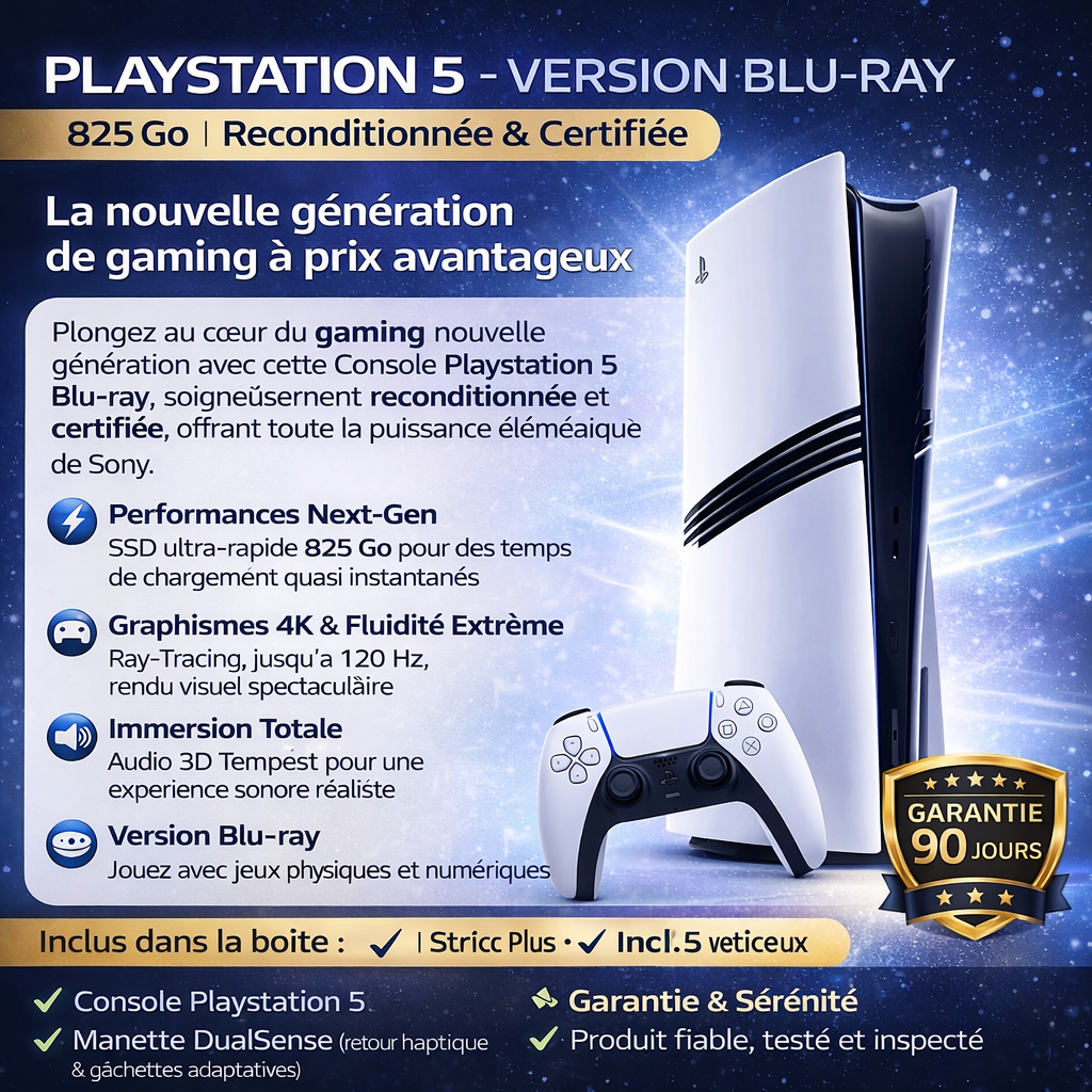 Get the next generation of gaming at a great price with this carefully refurbished and certified Blu-ray version of the PlayStation 5 (PS5). Claimed to be in excellent condition, it delivers Sony's signature performance for immersive 4K gaming experiences, with revolutionary loading times thanks to its ultra-fast 825GB SSD.