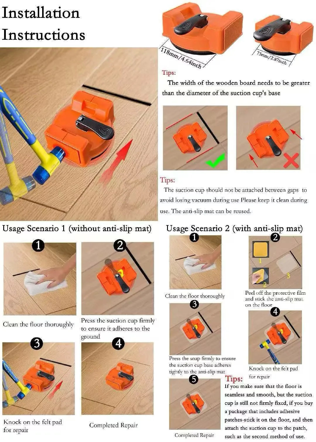 Ventosa de alto rendimiento: la almohadilla de silicona de 118 mm de diámetro utiliza un sistema de sellado al vacío (vacuum seal design) para adherirse firmemente a la superficie lisa de la tabla del piso sin rayarla ni marcarla. El material flexible se adapta perfectamente a las microirregularidades de la madera o el vinilo, asegurando una fijación estable y segura.