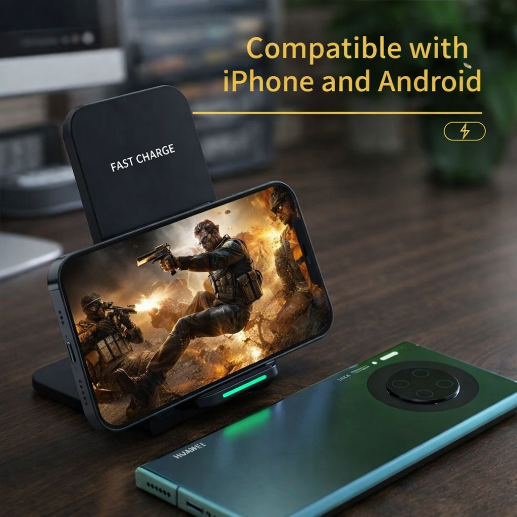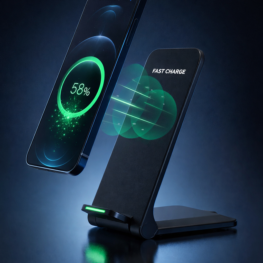 Este soporte de carga inalámbrica constituye una solución de alimentación por inducción ergonómica y de alto rendimiento, diseñada para ofrecer una experiencia de recarga simplificada y optimizada. Combinando la funcionalidad de una estación de acoplamiento con un sistema de soporte integrado, este dispositivo permite colocar el aparato en modo vertical u horizontal, garantizando al mismo tiempo una recarga rápida y sin contacto. Destinado a entornos profesionales y domésticos, satisface las exigencias de los usuarios que buscan tanto la eficiencia energética como la comodidad de uso.
