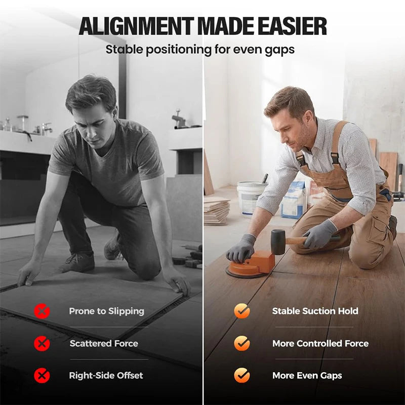 Adaptabilidad mediante altura ajustable: a diferencia de las herramientas de ventosa fijas, este modelo se adapta a todos los grosores comunes de lamas de suelo, garantizando un empuje horizontal perfecto sin riesgo de desalineación.
