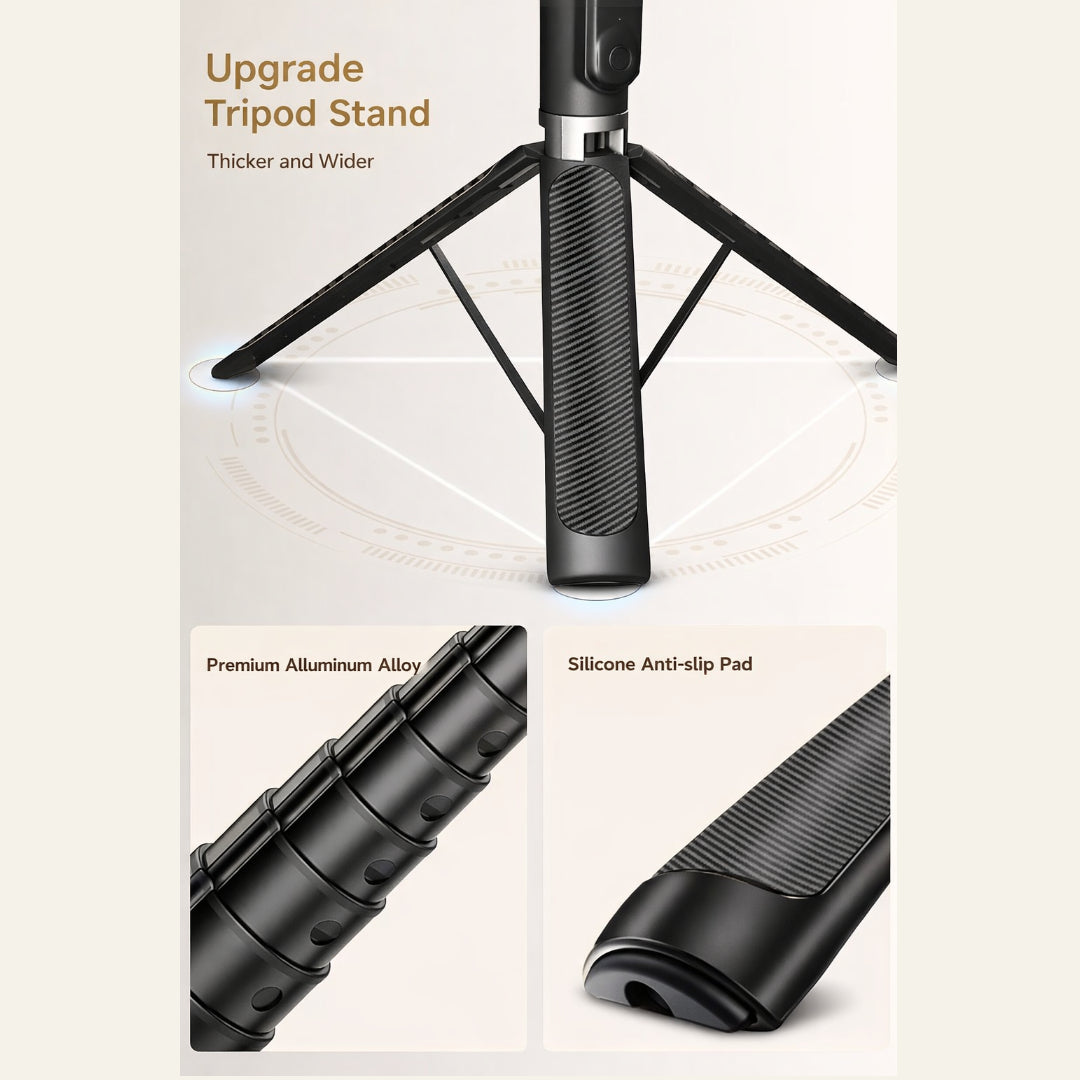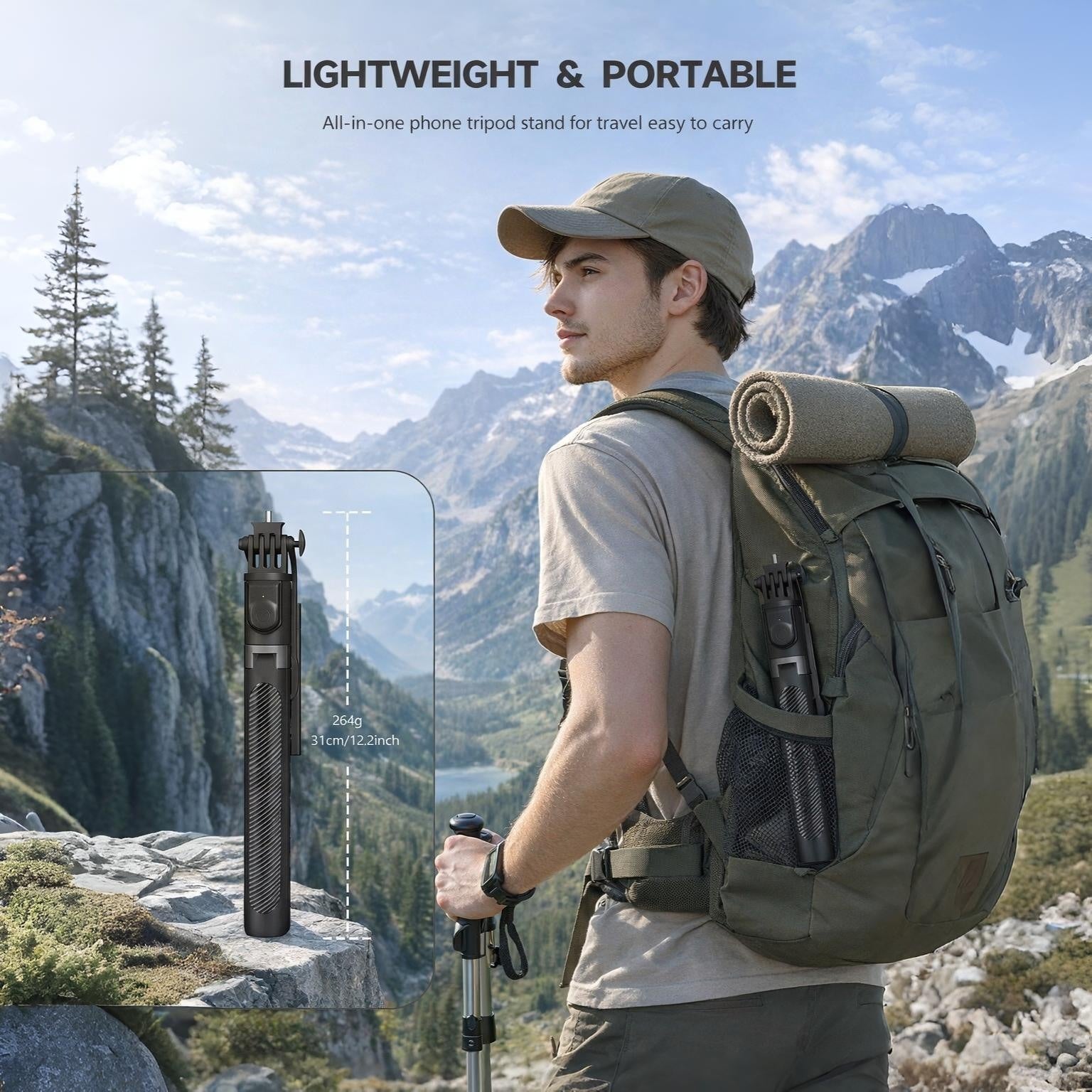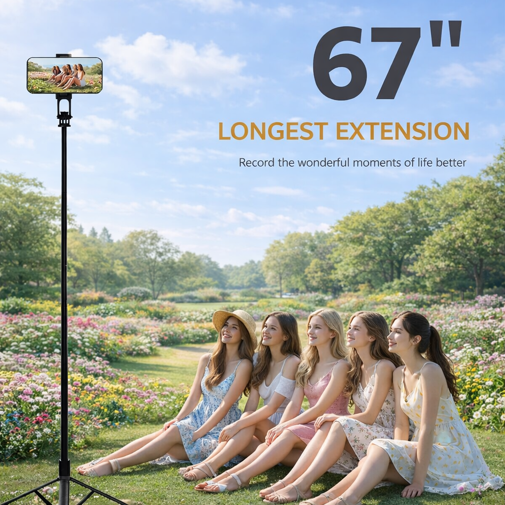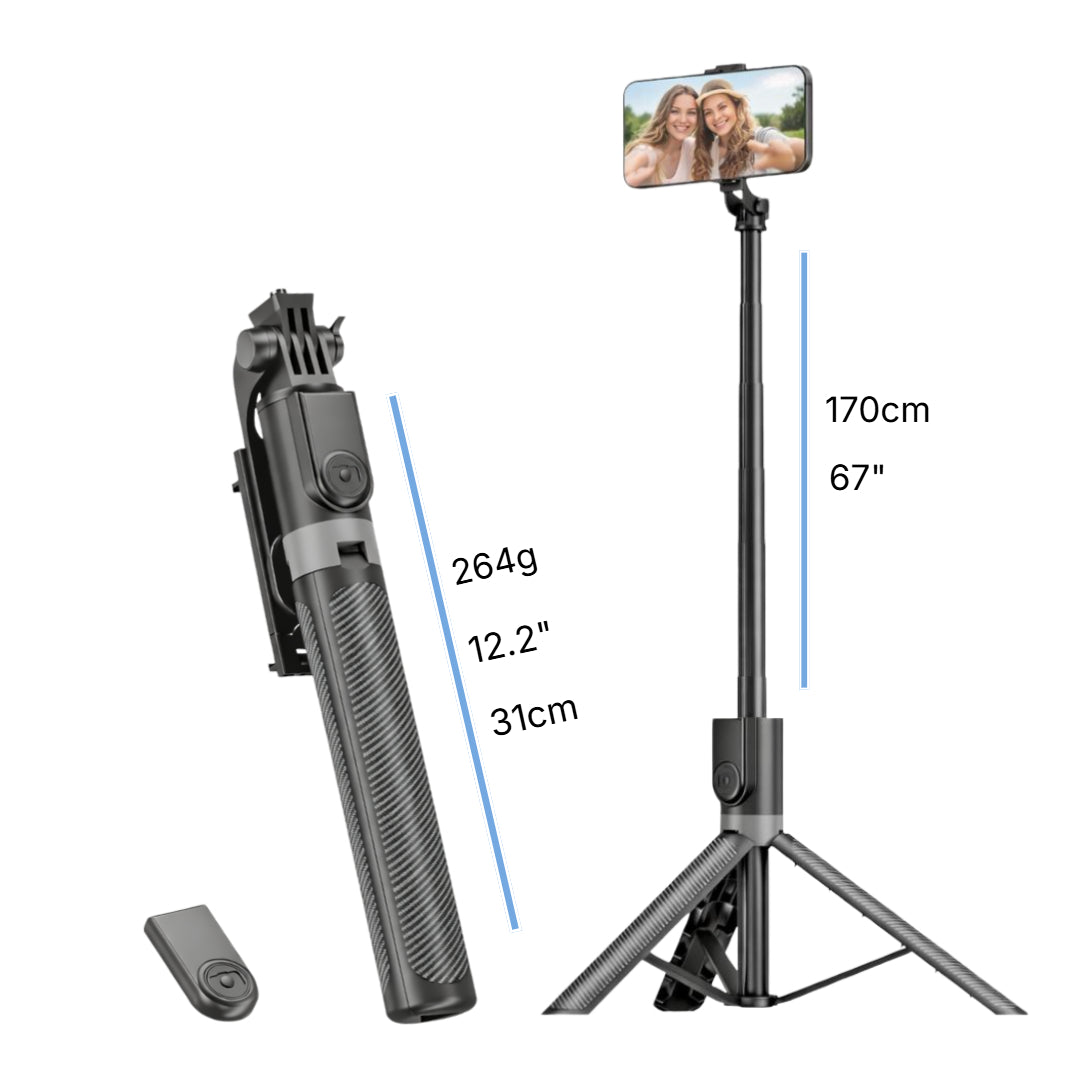 ■ Alcance y altura excepcionales : Se extiende de 31 cm (plegado) a 170 cm (desplegado) , lo que proporciona un alcance ideal para selfies grupales amplias, fotos de paisajes sin distorsión y tomas aéreas . Se transforma en un trípode estable para grabar videos o fotos sin fatiga.