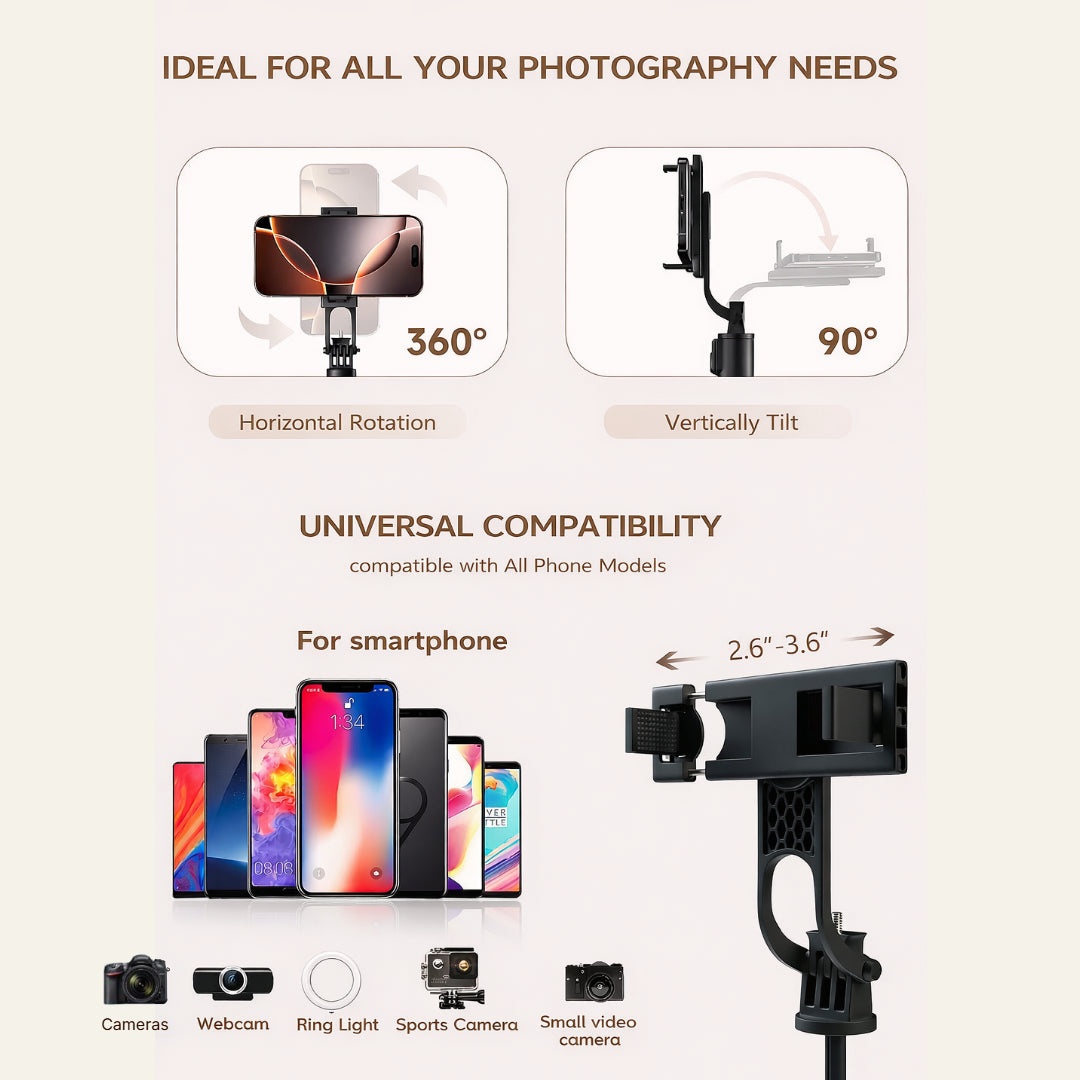■ Compatibilidad universal y montaje robusto : Soporte universal ajustable para dispositivos (ancho ajustable) compatible con todos los smartphones , incluso con carcasas delgadas. Rosca estándar integrada de 1/4 de pulgada para conectar cámaras , cámaras de acción (GoPro) o cámaras web .