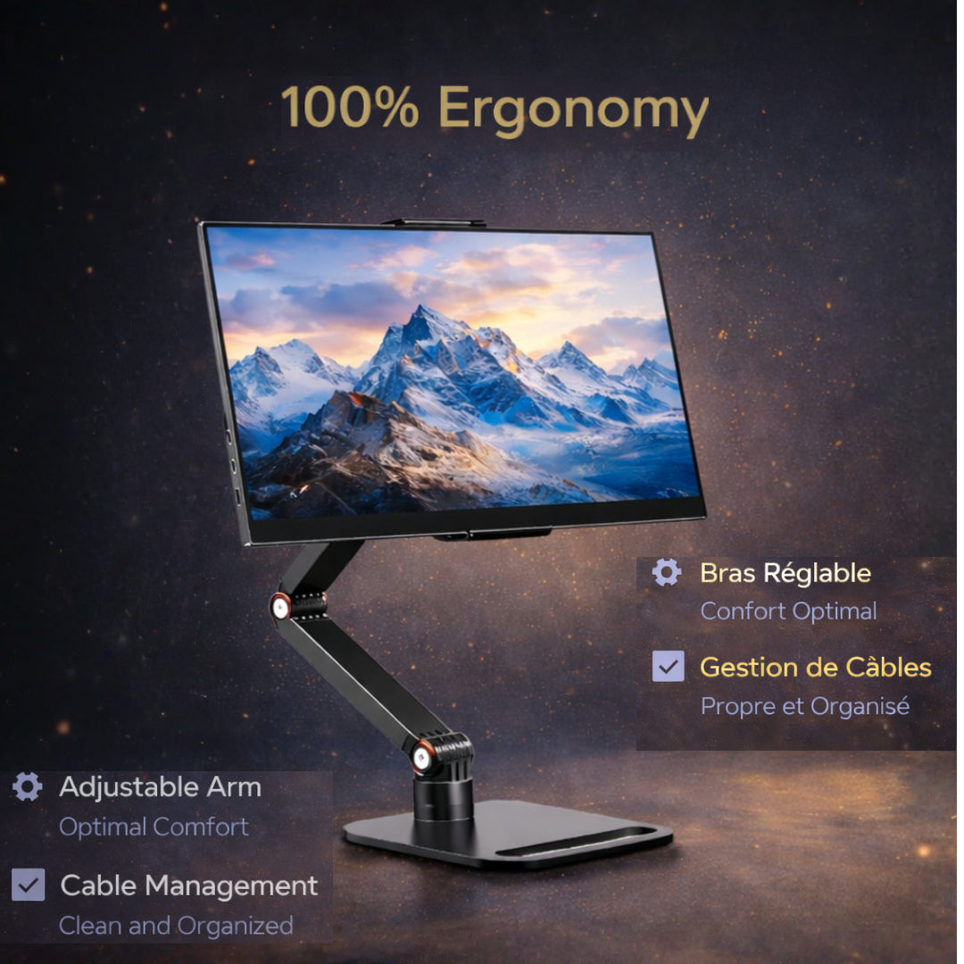 Ce support se distingue par sa conception en trois sections, permettant un réglage précis de la hauteur et de l’inclinaison de votre écran. Vous pouvez ainsi ajuster votre moniteur à la position idéale pour réduire les tensions cervicales et améliorer votre confort visuel au quotidien. La pince de serrage mesure 14 centimètres et peut s’étendre jusqu’à 26 centimètres, ce qui lui permet de s’adapter à la plupart des bureaux et tables. L’embase, quant à elle, mesure 14 centimètres de largeur pour 16 centimètres de longueur, assurant une assise compacte mais parfaitement stable.