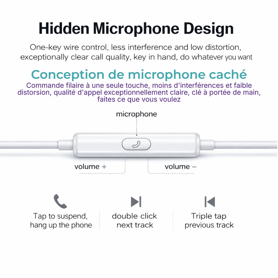 Contrôles Intégrés Complets : Bouton multifonction et contrôleur de volume sur câble.