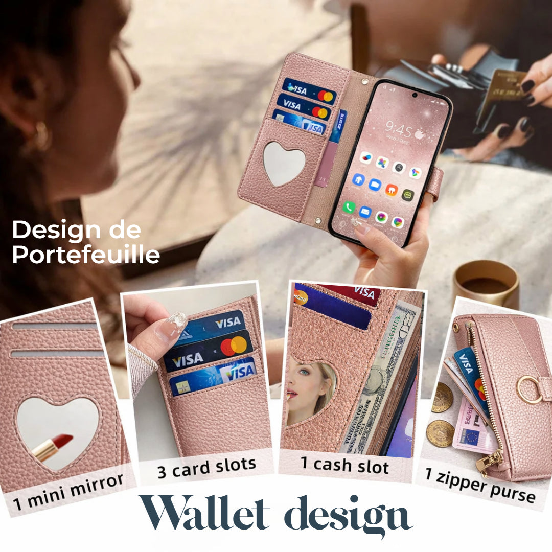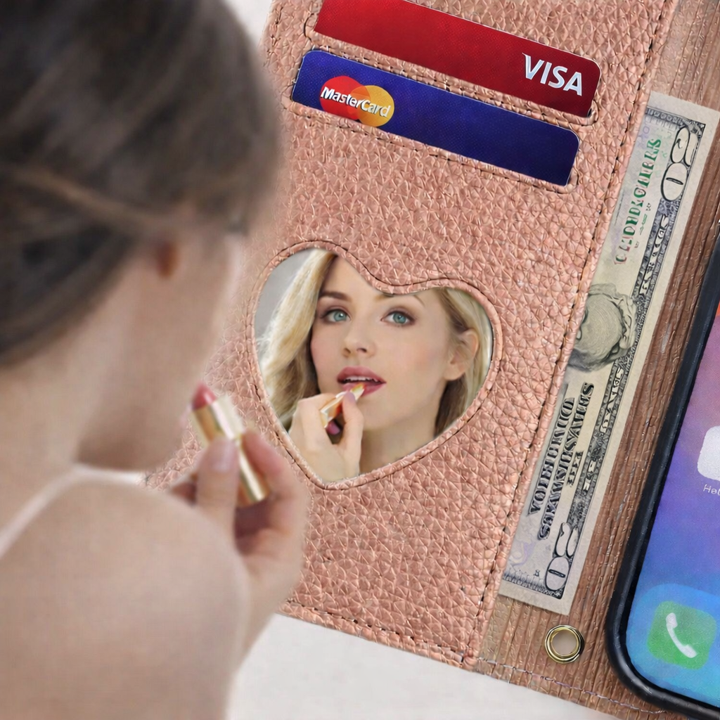 Parfait pour un usage quotidien pratique : combine protection du téléphone, rangement et miroir en un seul objet élégant.