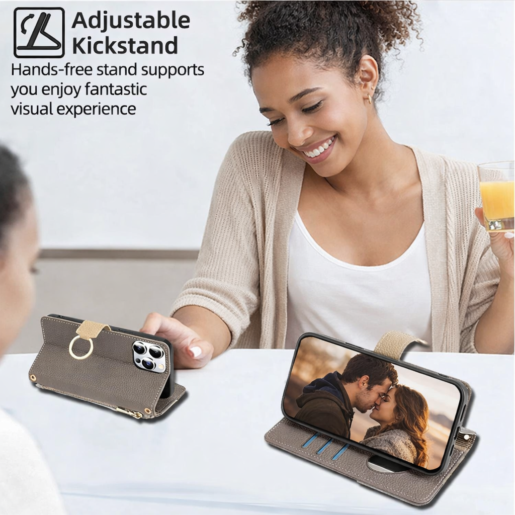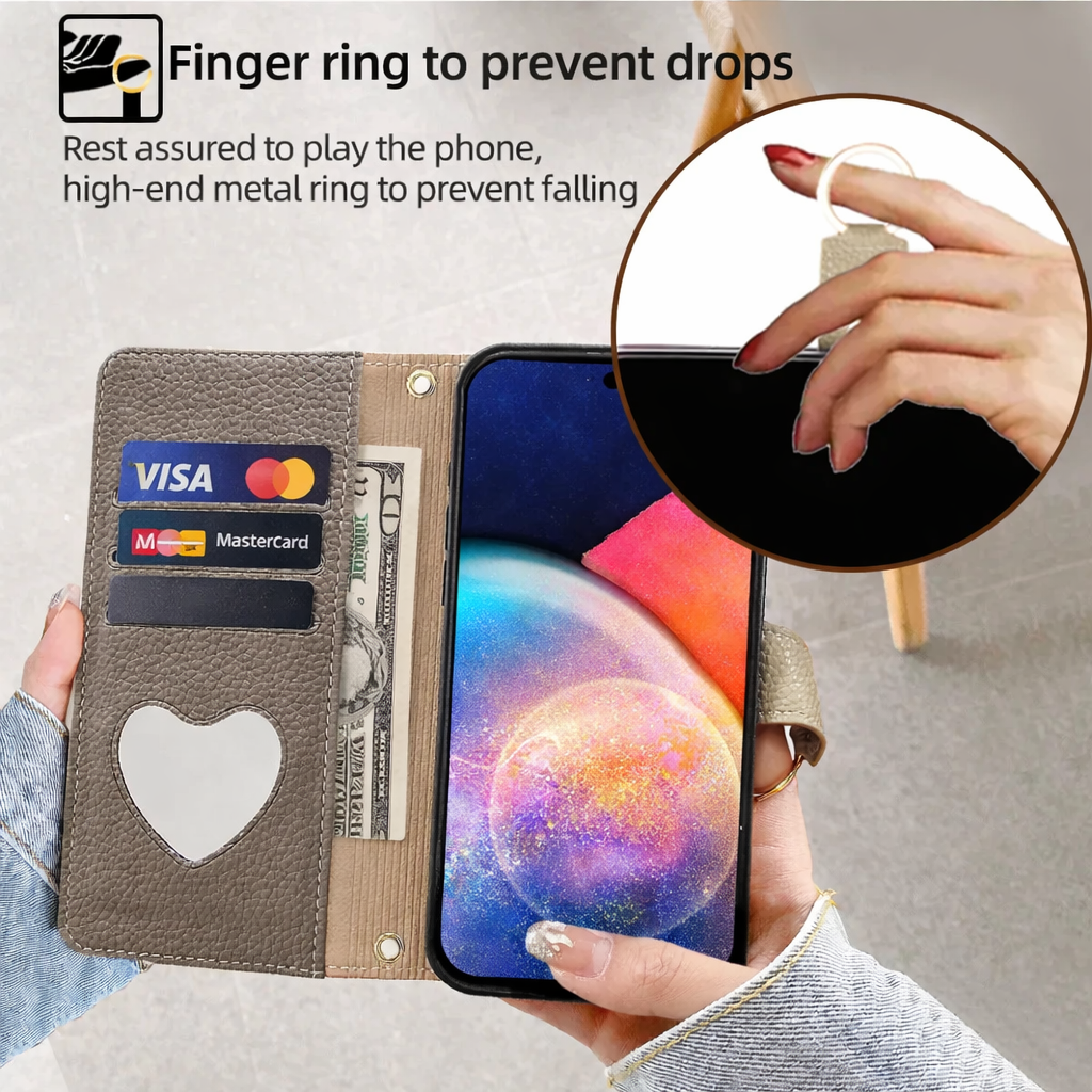 Libérez vos mains et organisez vos essentiels avec cet étui portefeuille bandoulière en cuir synthétique spécialement conçu pour la gamme Samsung Galaxy A. Alliant fonctionnalité pratique et style, cette pochette flip intègre un miroir, une longue dragonne ajustable, un anneau de maintien et un compartiment de rangement, offrant une solution tout-en-un pour transporter et protéger votre smartphone Samsung A05, A06, A16, A26 5G, et autres, en toute sécurité et avec élégance.