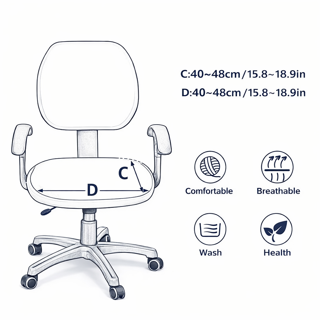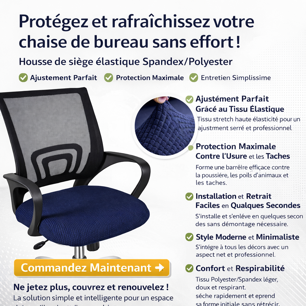 Ne jetez plus, couvrez et renouvelez ! Commandez dès maintenant votre housse de siège élastique Spandex et profitez d'une protection pratique, un nettoyage facile et un nouveau look instantané pour votre chaise de bureau. La solution simple et intelligente pour un espace de travail toujours impeccable.