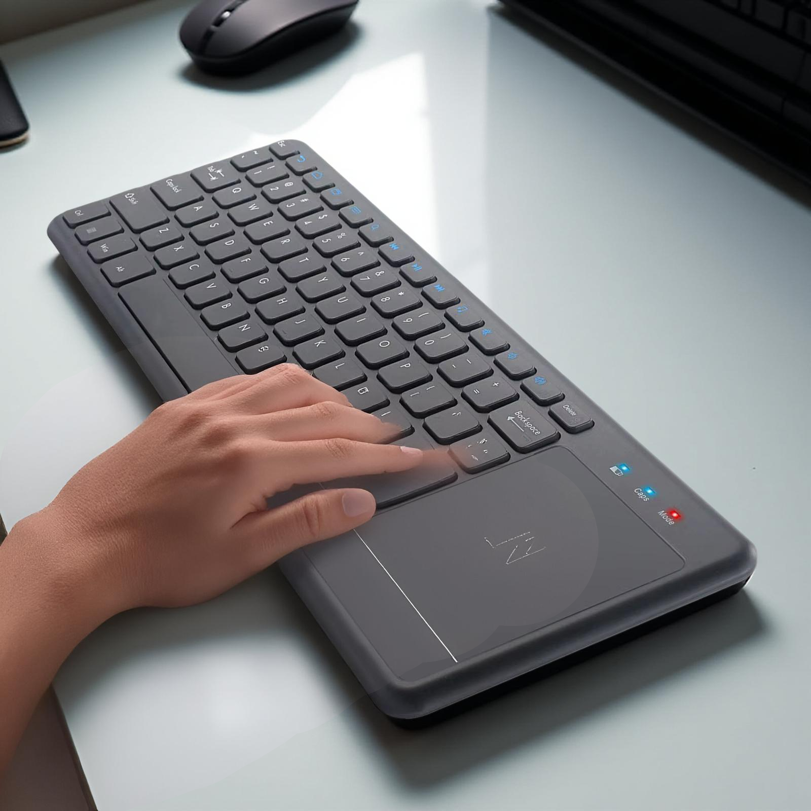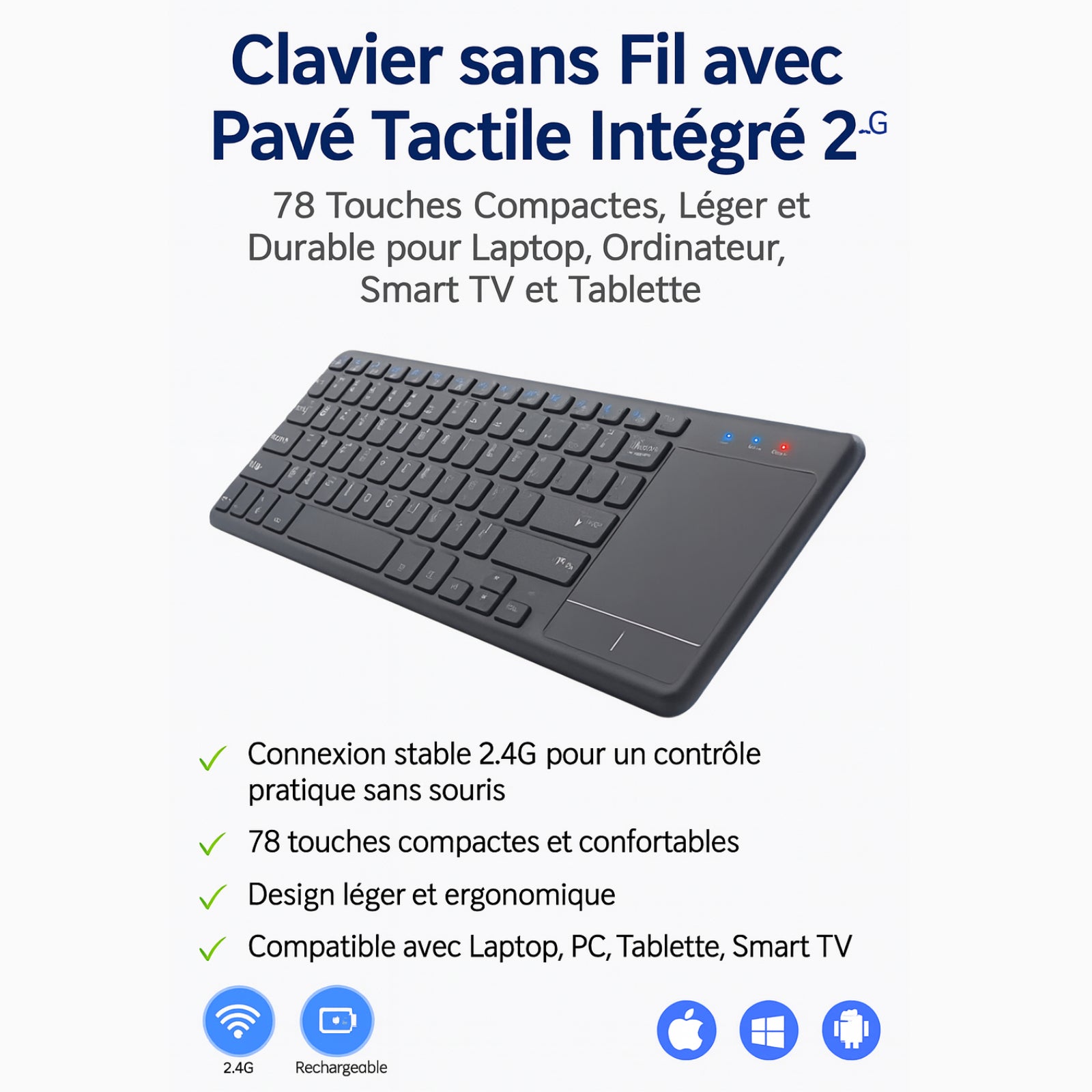 Découvrez le clavier sans fil Prettyia avec pavé tactile intégré, conçu pour allier praticité, ergonomie et élégance. Grâce à sa technologie 2.4 GHz stable, profitez d’une connexion rapide et fiable sans latence, idéale pour vos ordinateurs portables, PC de bureau, tablettes et Smart TV.